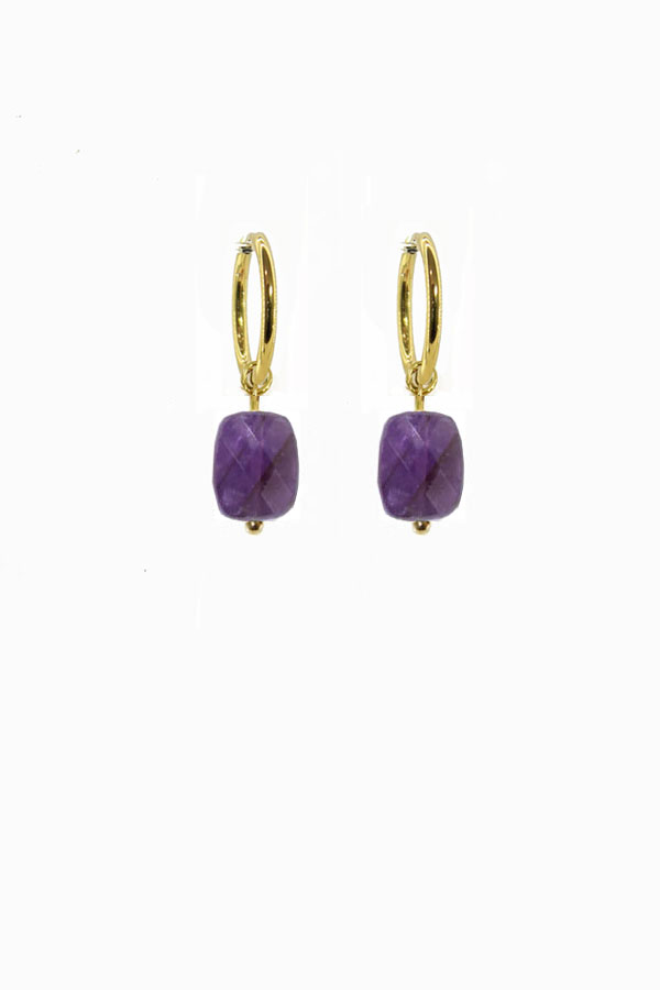 Faceted amethyst stones dangle from 18k gold plated stainless steel hoops. 1.1 inches, nickel free.