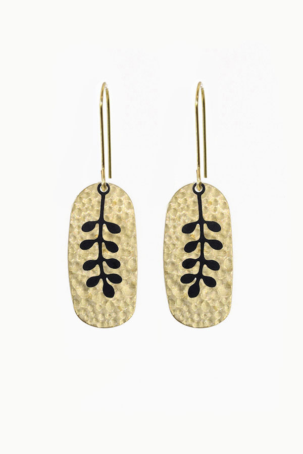 Hammered brass ovals topped with black oxidized brass leaves on modern brass ear wires. 1.9 inches, nickel free.