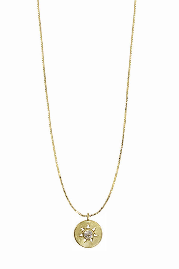Cubic zirconia embellished cut out sun pendant on a 16 to 18 inch fine18k gold plated brass box chain. Pendant is .4 inches. Nickel free.