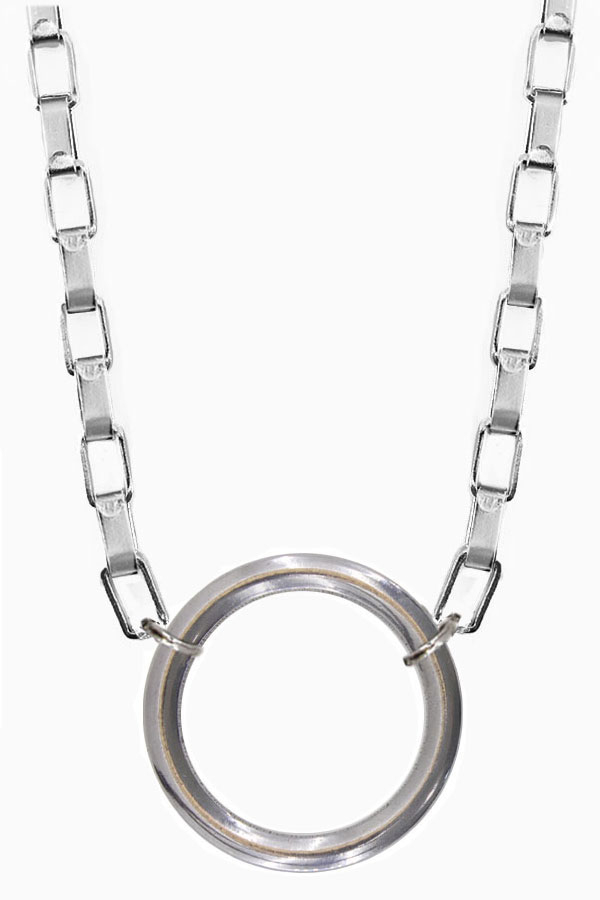 Fun stainless steel chain necklace with a 1.3 inch solid ring centerpiece. Total length is 16 to 18 inches