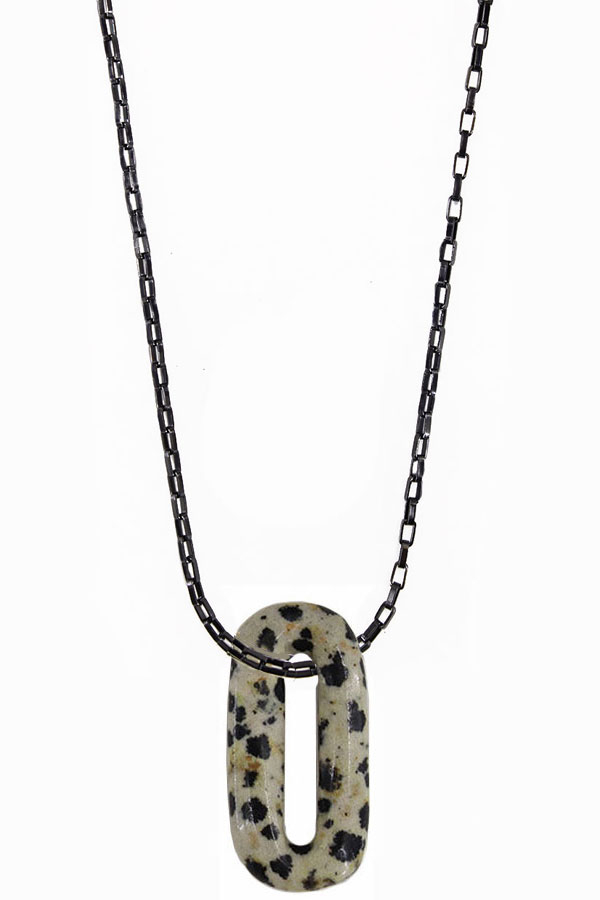 1.2 inch Dalmation jasper oval on an 200 to 22 inch blackened steel chain with 18k gold plated findings. Nickel free.