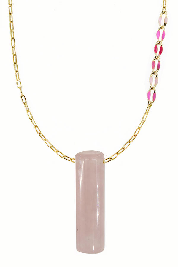 A rose quartz stone rod dangles simply on a fine 20 to 22 inch 18k gold plated stainless with enamel accented segment. Pendant is 1.5 inches. Nickel free.